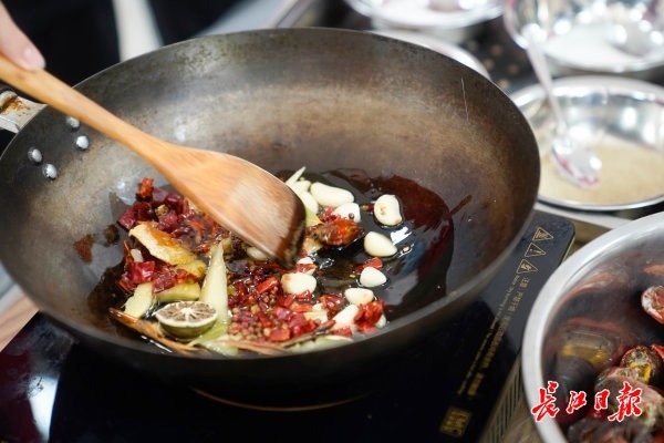 热锅倒入油,加入葱姜蒜翻炒,加香料,再把龙虾倒入锅中……王博寻手上一边忙活,一边告诉同学们做油焖大虾的要诀:“烧的时候要注意火候和时间,烧过头了肉就不嫩,盖上锅盖焖这一步千万别忘,焖了虾才能更入味……”