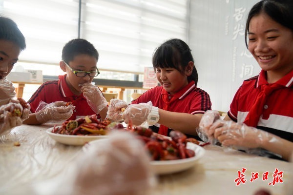 同学们一起品尝小龙虾。 记者彭年 摄