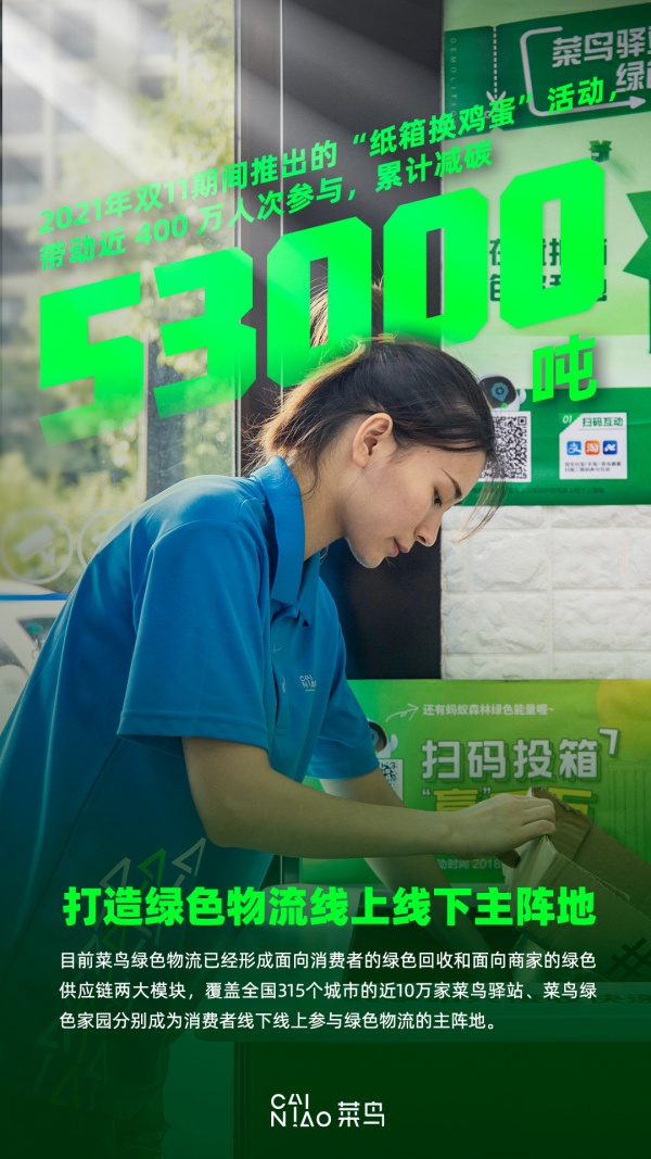 面向消费者,菜鸟对“回箱计划”进行升级,绿色回收箱覆盖到全国31个省(自治区、直 辖市)的315个城市近10万个菜鸟驿站,“双11”期间推出的“纸箱换鸡蛋”活动,带动近400万人次参与快递包装回收,累计减碳5.3万吨。