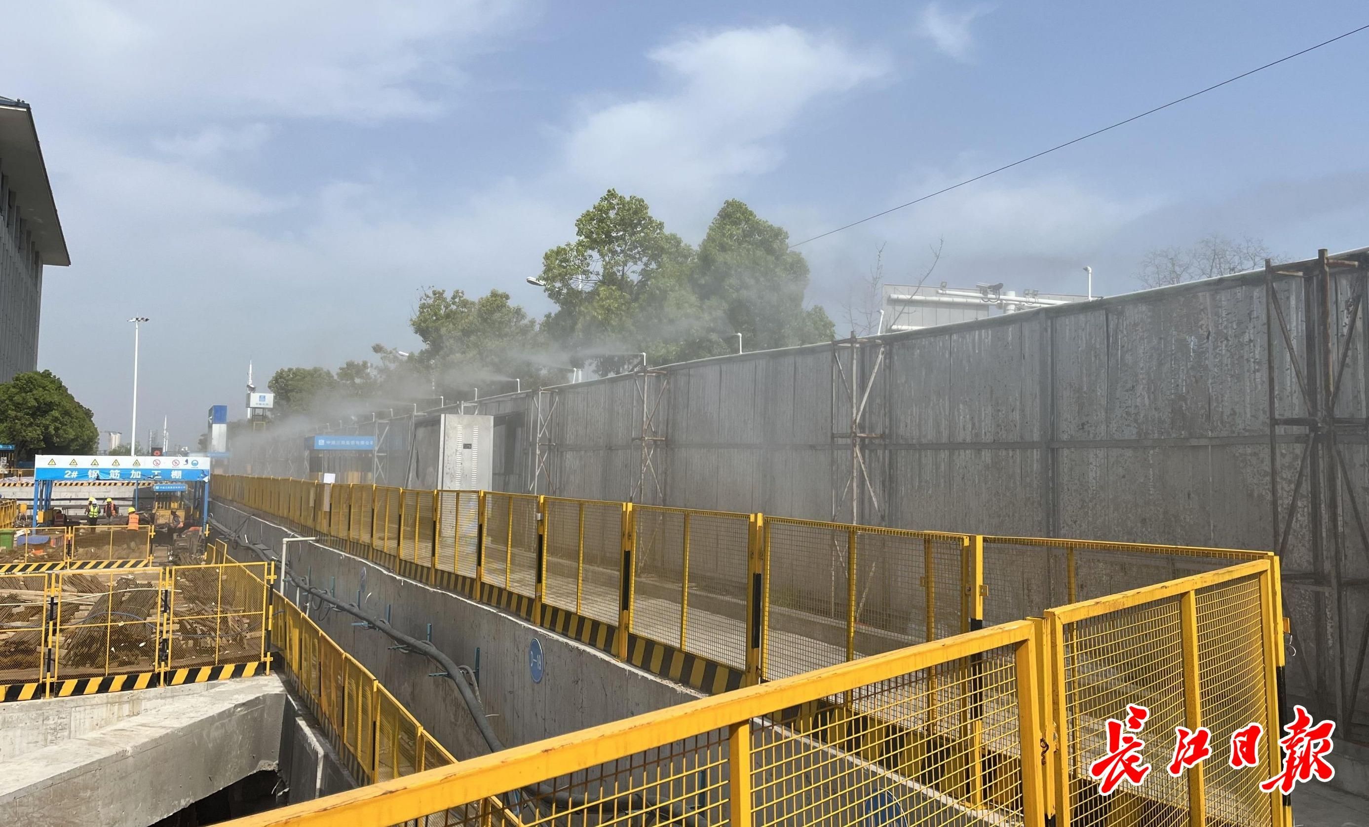 武汉市中医医院(汉阳院区)住院综合楼工程工地围墙设置自动喷淋系统,扬尘监测仪器一旦报警,喷淋便自动开启。彭海洋供图