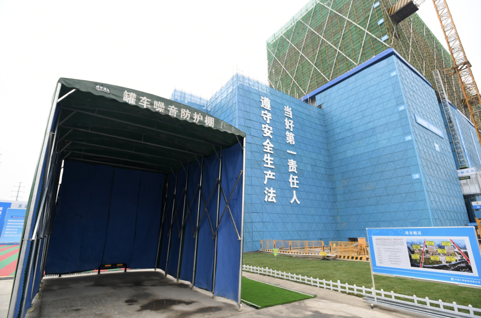 5月26日上午,全市建筑施工噪声治理工作推进会暨2022年“静音护考”动员会,在洪山区武汉中心医院杨春湖分院建筑工地举行,该工地主体建筑外安装了降噪冲孔钢板网(右),在道路上设置罐车噪音防护棚(左)。记者周超 摄