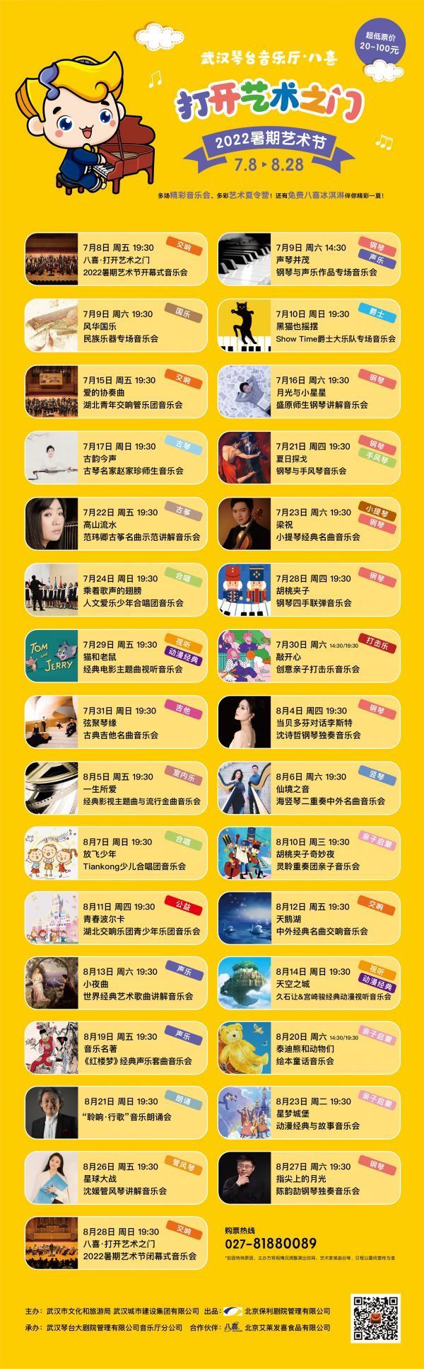 长江日报大武汉客户端5月26日讯(记者范雅琴 通讯员孙妮)5月26日,记者从琴台音乐厅获悉,每年暑期最受孩子们欢迎、最多彩、最盛大的公益艺术节琴台音乐厅“打开艺术之门·2022暑期艺术节”将于7月8日开幕。52天,33场精彩纷呈的演出、3场艺术课堂和3期艺术夏令营将陪伴孩子们度过快乐的暑期。
