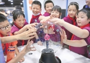 同学们争相将手放在“等离子球”上,感受人体导电原理。记者高勇 摄