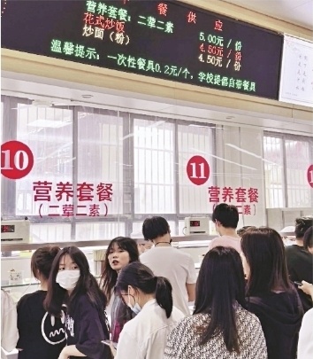 记者在武汉市第一商业学校学生食堂的电子屏上,看到清楚的标价“两荤两素5元”!