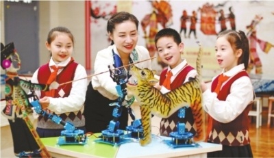 在光谷第十五小学,每个孩子都会玩皮影,学校每学期还有皮影节,一出出反映孩子们日常学习生活中趣事、囧事的皮影戏接连上演,让全校孩子们都沉浸在“皮影狂欢”中。学校开发的智能皮影戏将传统皮影与微电子技术、物理机械运动相结合,使皮影人物在无人操作的情况下,按照编程做出相应动作,并同步伴以音乐唱腔,实现了古典融于现代、艺术嫁接科技的演出形式。