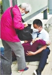 6时55分,公交车到达银柏路民田村车站,涂朋再次停车,上前查看老人状况,发现老人面色苍白,满头大汗,眼看就要晕倒。涂朋立马将老人抱住,其他乘客也上前帮忙,一起把老人扶下车。