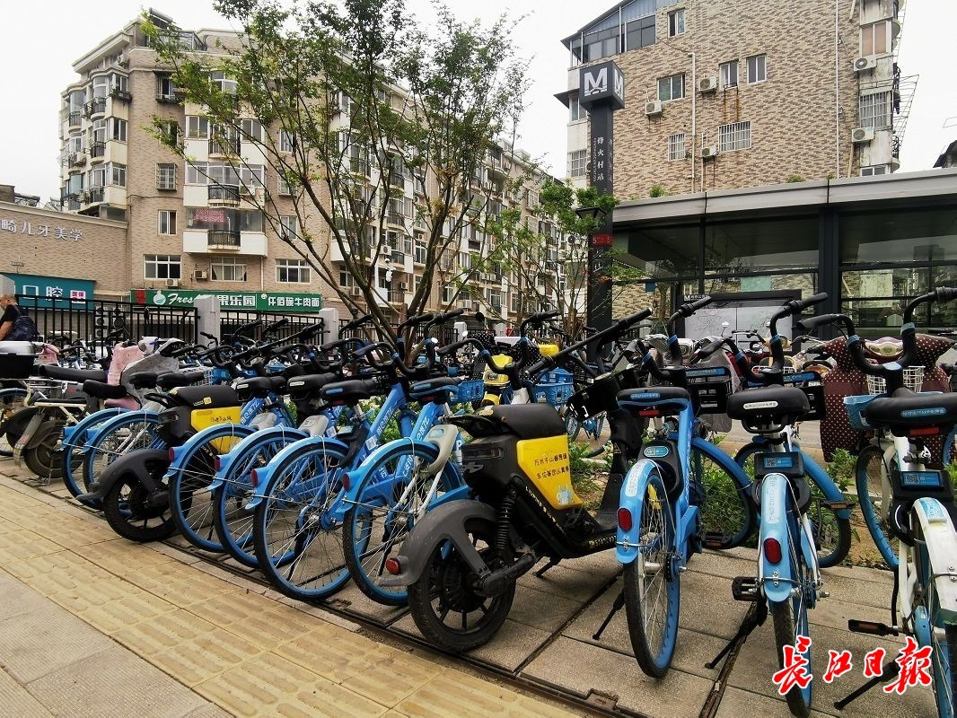烽火村地铁站外,共享电单车停在共享单车中间。长江日报记者孙笑天 摄