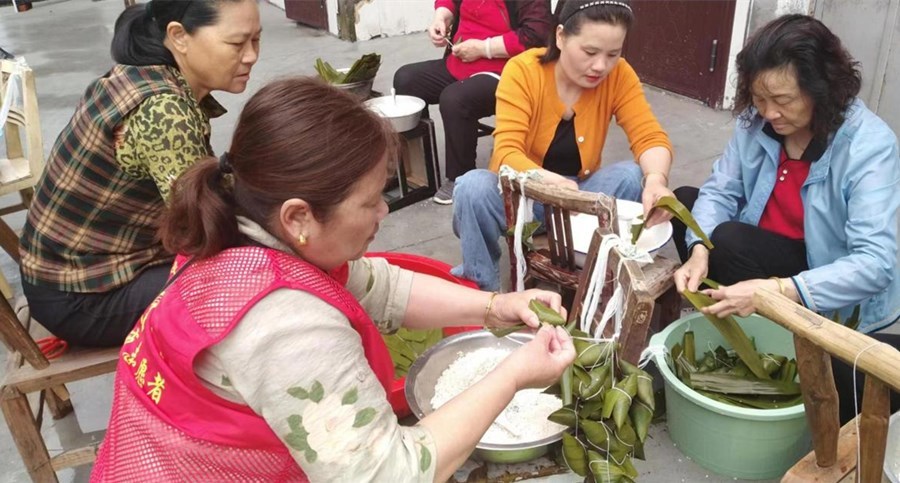 活动现场,大家分工合作,淘米、洗粽叶、调粽馅、剪粽绳、包粽子,其乐融融。大家纷纷使出看家本领,折粽叶、放糯米、加蜜枣、裹扎绳,动作麻利、一气呵成,不一会儿的功夫,一片片粽叶、一粒粒糯米,在大家一双双灵巧的手中变成香甜的粽子。