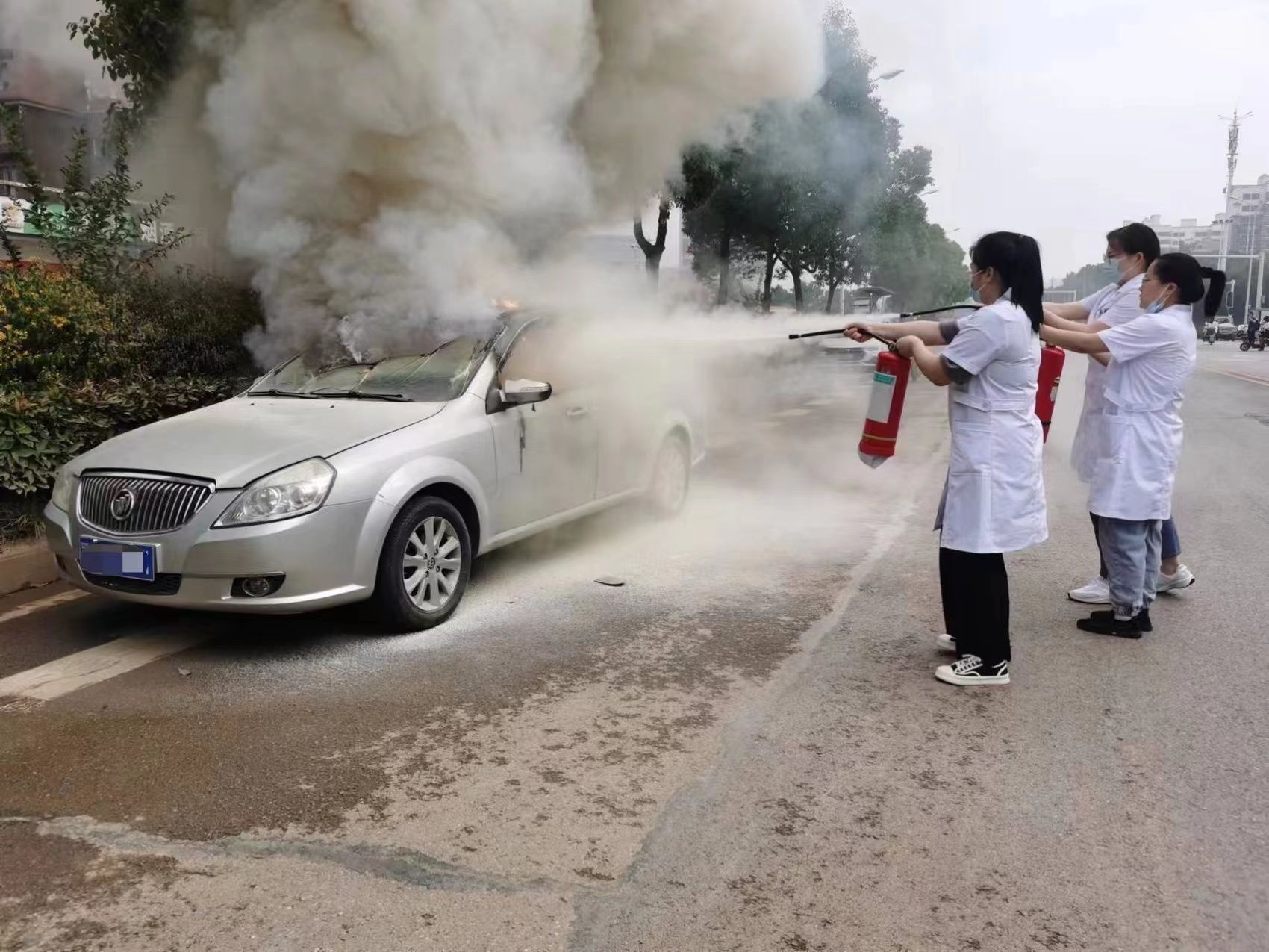 5月25日上午8时许,医院的保洁阿姨程时英出门处理生活垃圾时,发现马路对面有一辆小轿车燃起了熊熊大火。程时英赶紧跑回医院,向导诊台正在值班的护士杨严霞呼喊“马路对面有一辆小车起火了!”此时,正在一楼巡视的值班主任张云听到起火消息,赶紧拨打了119报警电话。