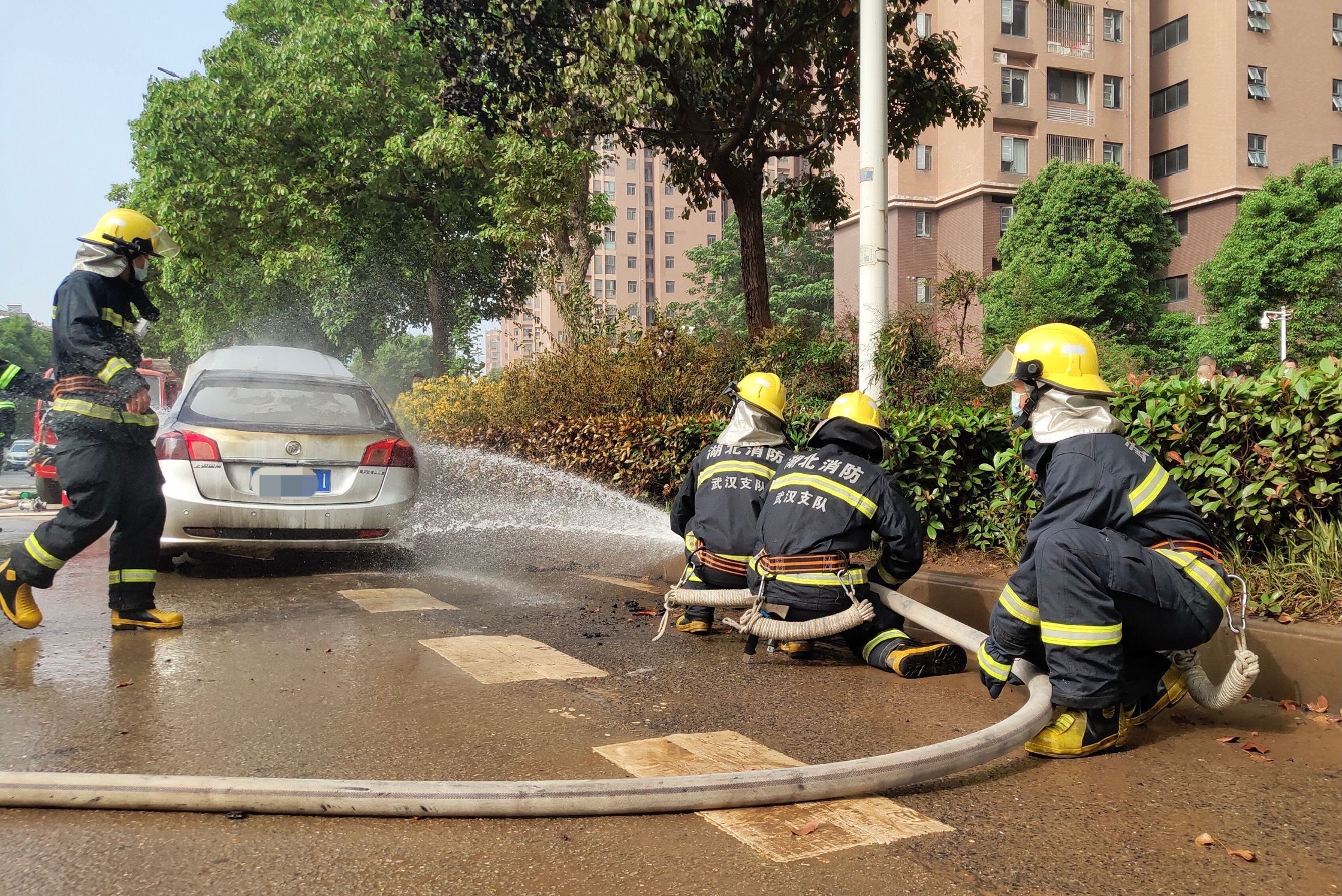 张迪、韩明洁和程群来到轿车旁,迅速拿起灭火器,对准起火部位进行扑救,他们将手中的灭火器喷射完后,火势也被立刻压制下去。但没过多久,车辆内部又燃起火来,几名医护人员只能穿过马路返回医院继续寻找灭火器。与此同时,距离现场最近的梁山头社区微型消防站的5名义务消防队员及时赶到现场,并使用水枪对火灾进行扑救。三分钟后,江夏区栗庙小型站的6名消防员赶到现场进行灭火。