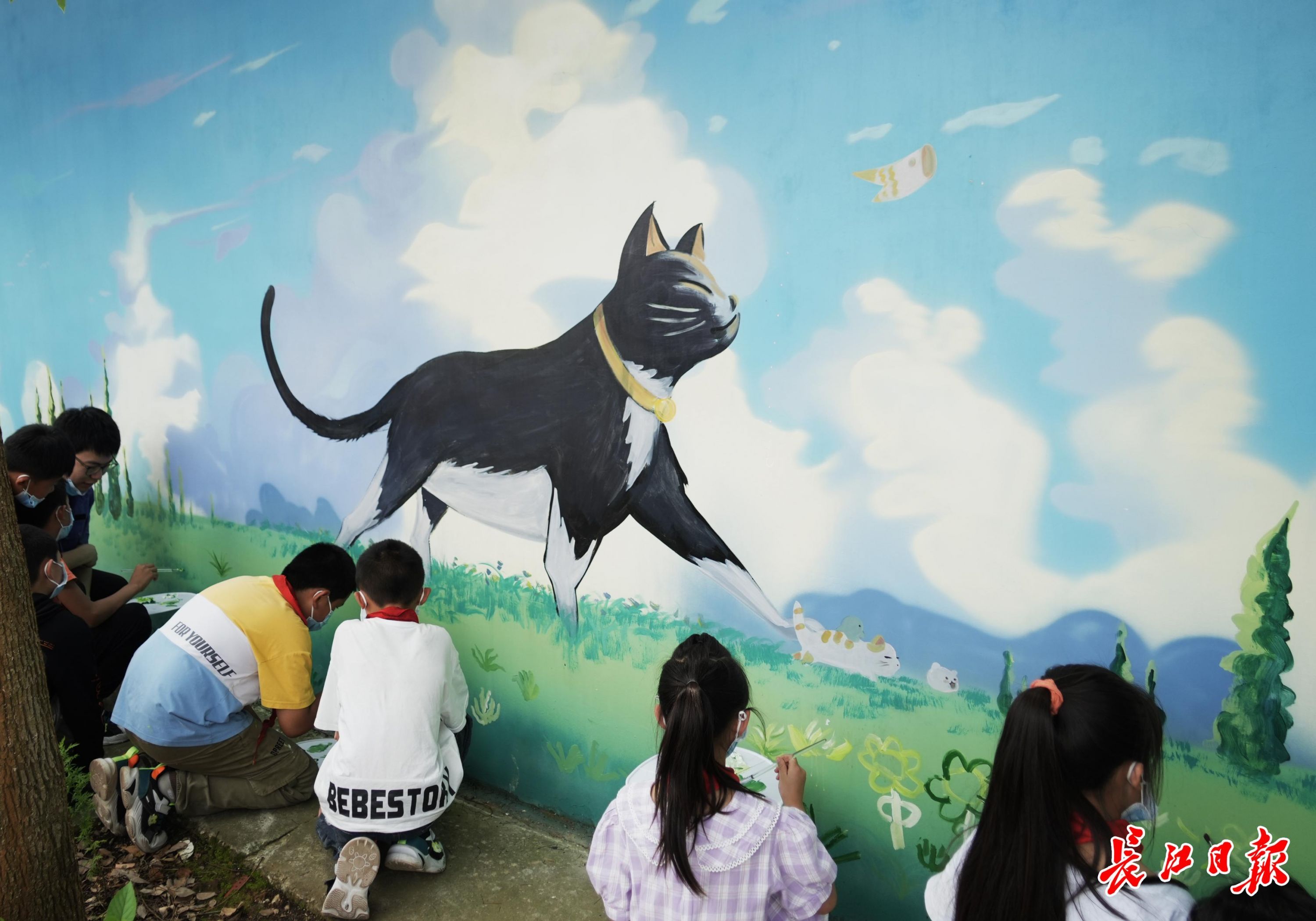 长江日报大武汉客户端5月27日讯(记者李文婕 通讯员宋扬)童真的笑声,在操场上此起彼伏回荡,欢快的画刷,于白墙间上下飞舞涂鸦,不经意间,一幅20余米长的大型墙绘便悄然呈现,化作乡村新的美丽画卷。27日,武汉江夏区舒安小学,“百画千书助力乡村振兴公益活动”现场,成了当地学生们兴奋不已的游乐场。