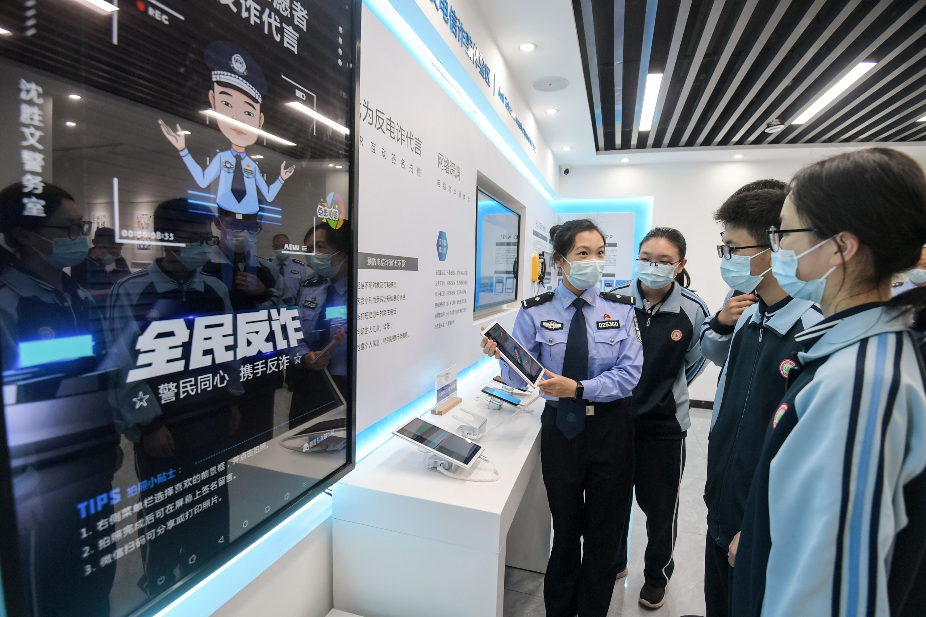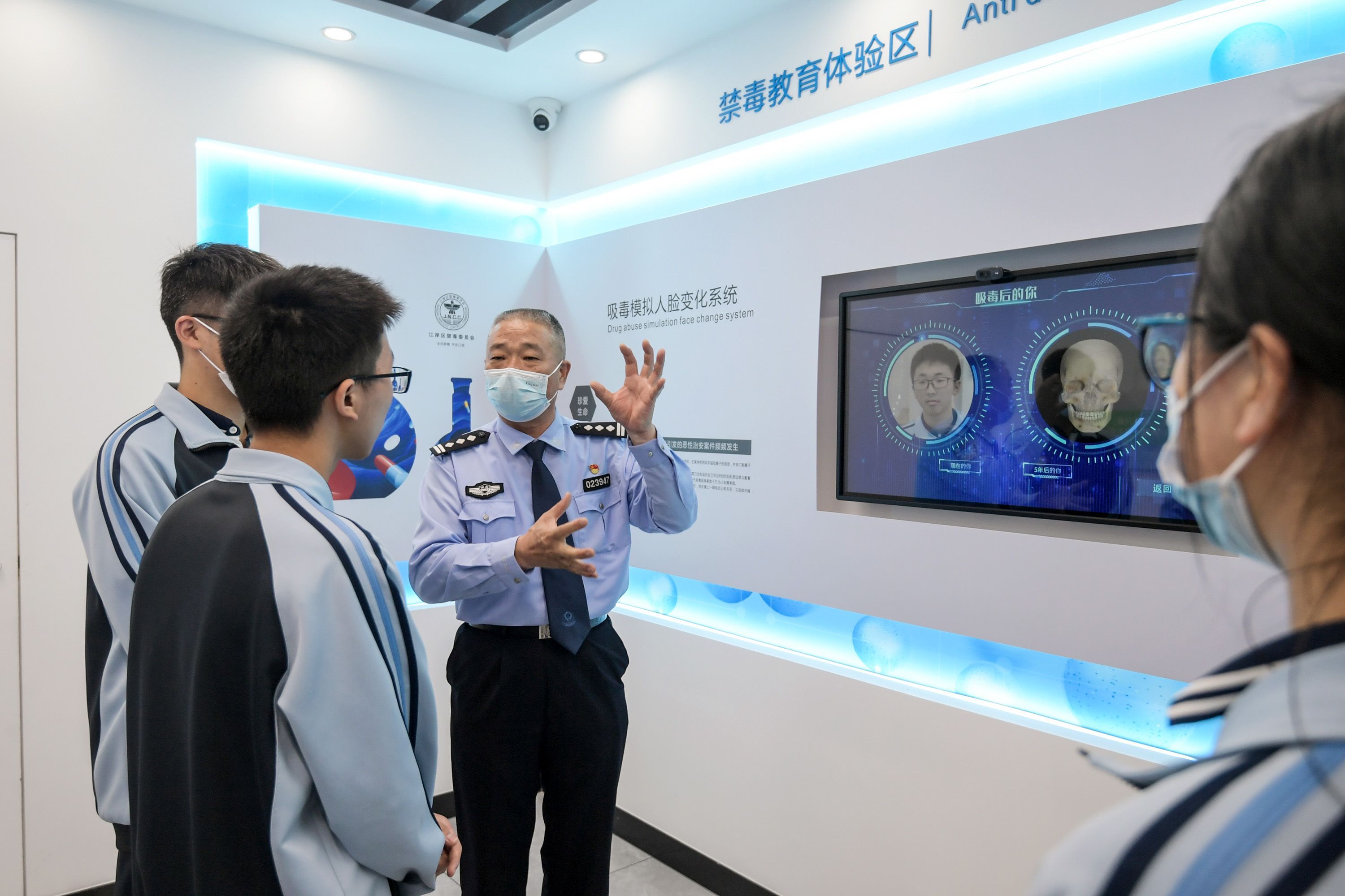 当天,武汉市汉铁高级中学的同学们在老师带领下走进警务室,在96110反诈专线体验区,同学们拿起墙上的耳机,体验身边的电信诈骗真实案例。在禁毒知识宣传体验区,民警向同学们宣传毒品的危害性。