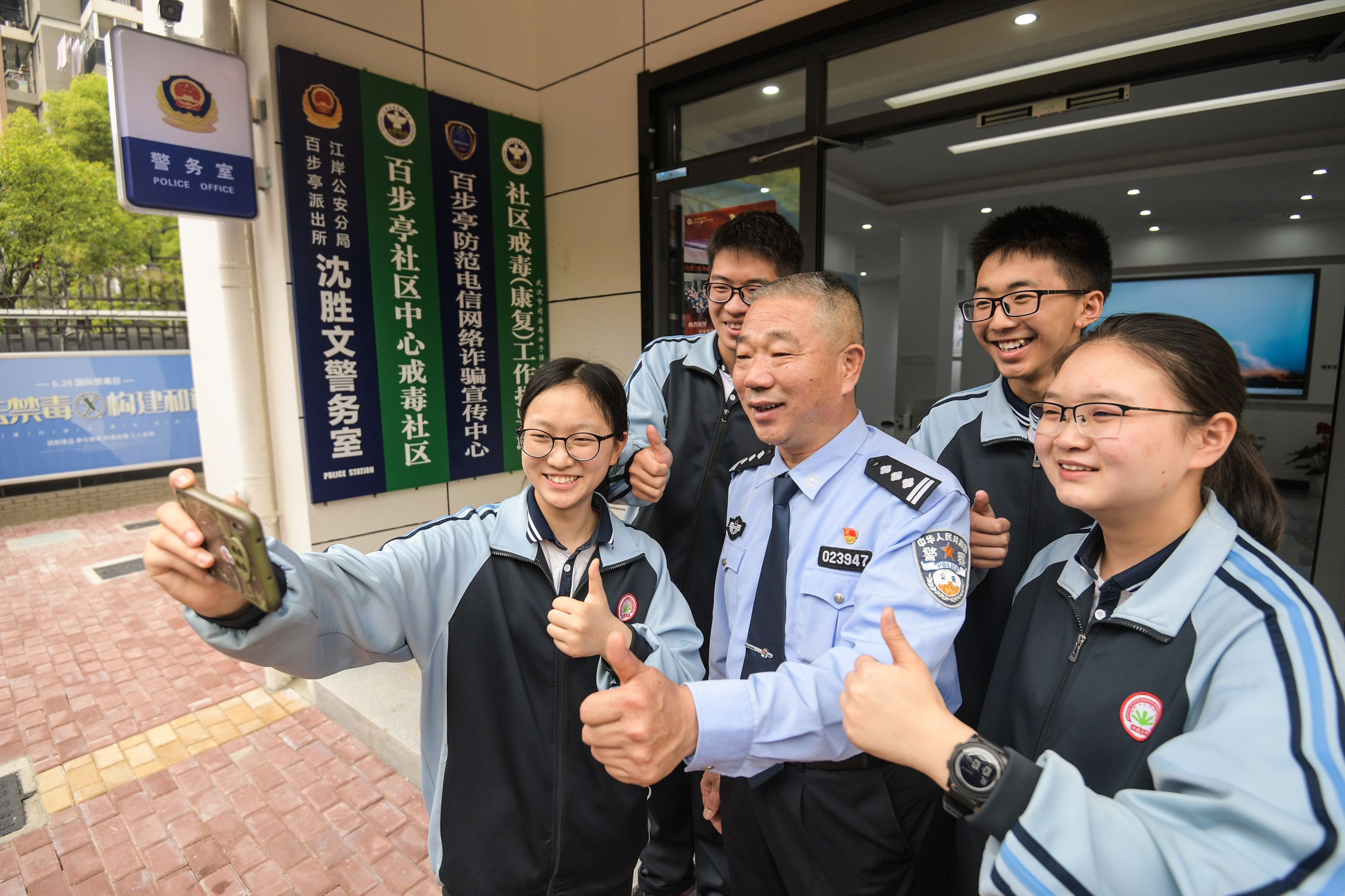 5月27日,沈胜文在警务室与前来参观的学生合影。记者史伟 摄