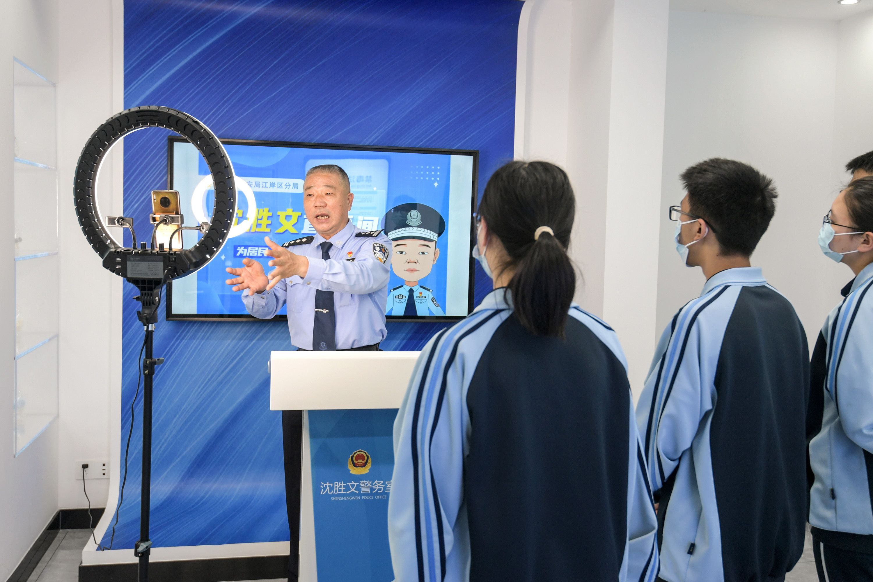 沈胜文在警务室内通过网络直播宣传反电信诈骗知识。记者史伟 摄