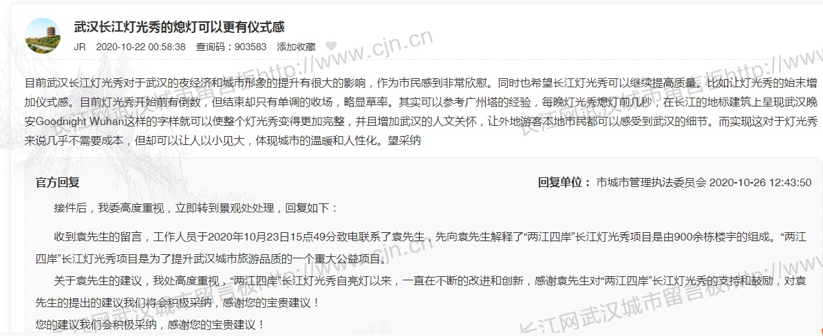 长江灯光秀“武汉晚安”来自小伙建议,留言半个月即被采纳实施