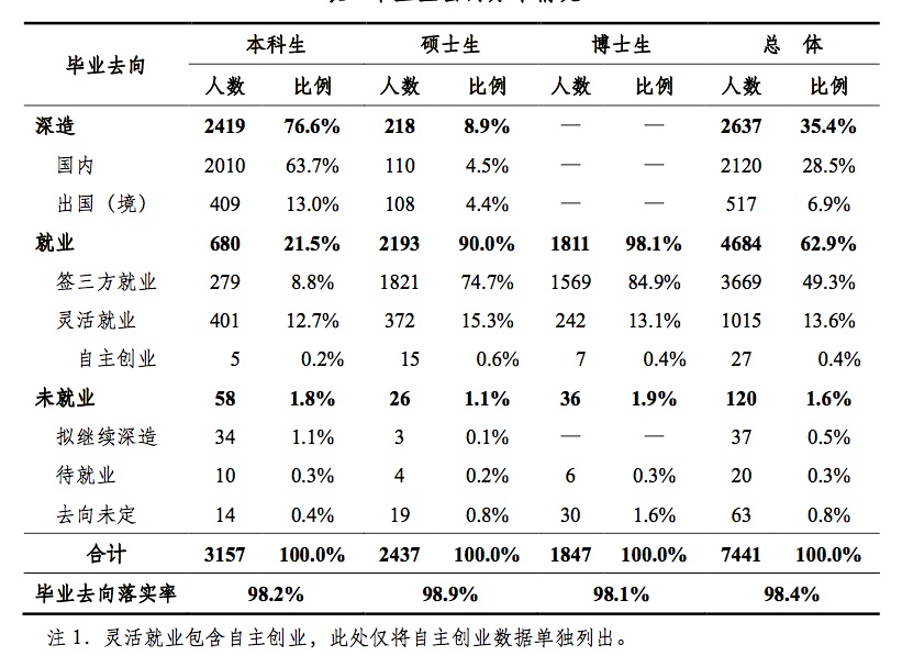 2018年,共有博士毕业生1486人,就业率达98.9%,为五年来最高。其中,未就业人数为16人,拟继续深造的有4人,3人待就业,9人去向未定。