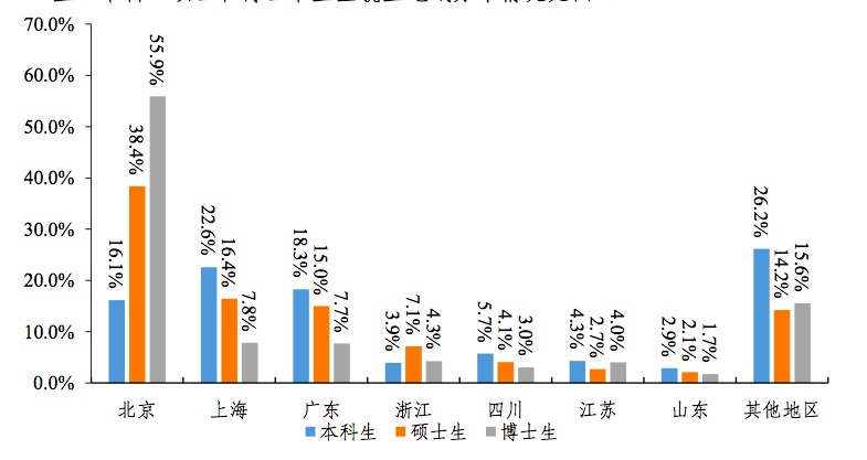 除北京外,广东省是博士毕业生爱去的第二大区域,但从去年开始,上海开始超越广东,成为博士毕业生就业的第二选择地。同时,四川、江苏、浙江和福建也是博士们选择较多的区域。