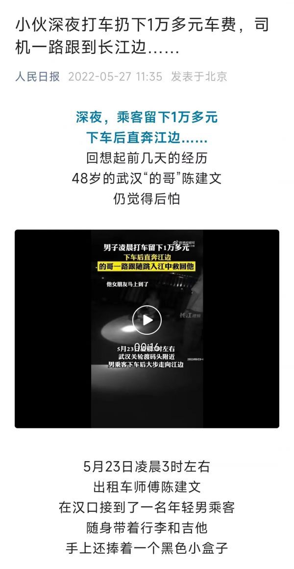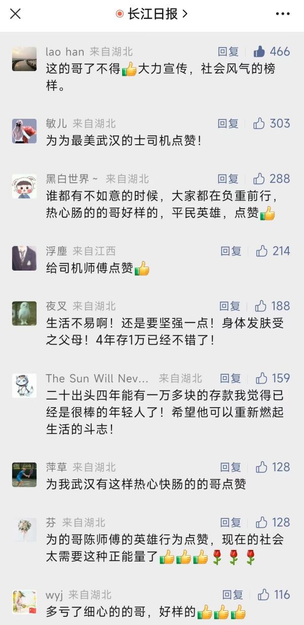 长江日报大武汉客户端5月27日讯(记者雷衎)“武汉的哥好样的!”“感谢这位平民英雄,拯救了一个家庭。”5月26日,长江日报官方微信推出报道《小伙深夜打车扔下1万多元车费,司机一路跟到长江边……》,引起社会强烈反响。网友纷纷为华昌出租车公司司机陈建文跳江救人的善举点赞。