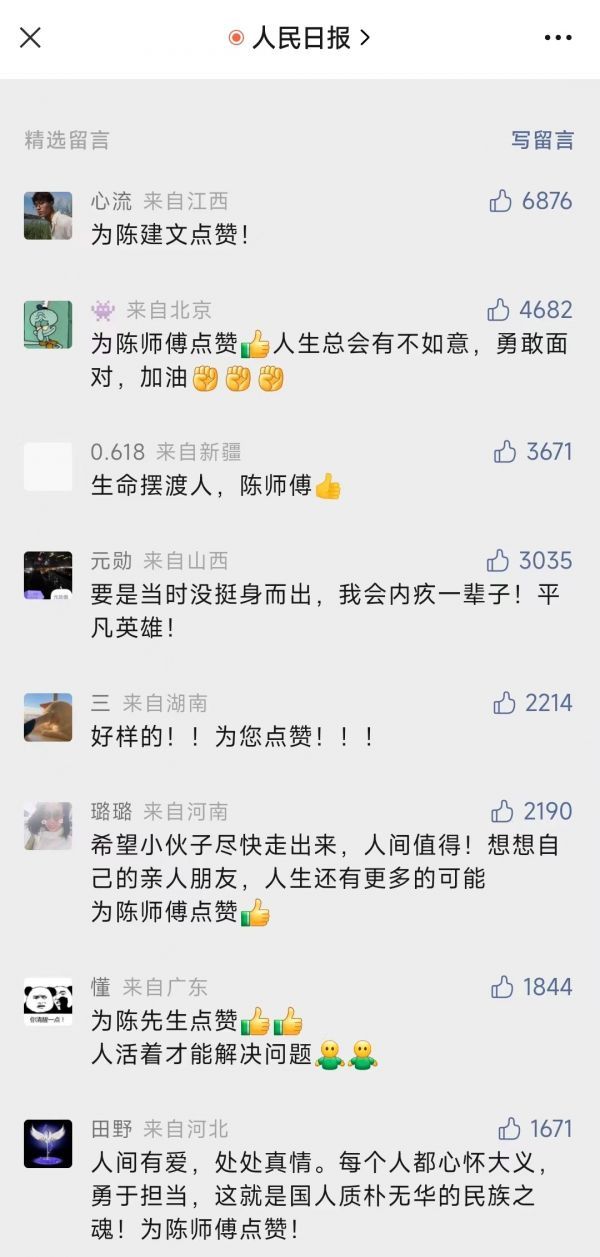 网友“意料之外”则表示:“的哥陈建文好样的,还有劝慰跳河青年的民警们,你们都是我们大武汉城市英雄,为你们点赞。”