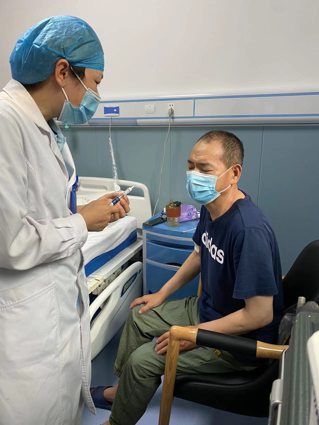 殷翠平为刘先生仔细演示了预混胰岛素的摇匀方法:预混胰岛素应在手掌水平滚搓至少10次,手肘和小臂上下摇晃10次,动作宜轻柔,重复操作直到胰岛素透明的部分和乳白色的部分混合成没有絮状物的均匀乳白色悬浮液后才可进行注射。