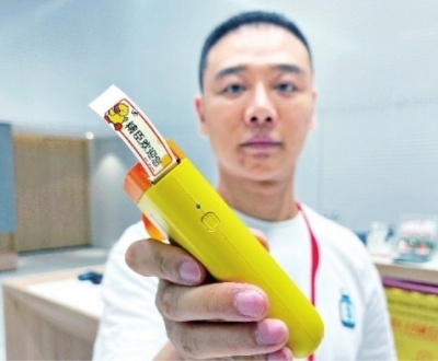 在精臣智慧内,记者体验了便捷的智能标签打印,一台巴掌大小的打印机,通过蓝牙与手机连接,在手机的APP内选择标签模板、输入内容,按下打印按钮,一个约15毫米宽的标签,一秒内就打印出来。
