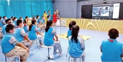 27日,新疆博乐市第一小学507班(大屏幕视频中)和湖北省武昌实验小学五(1)班全体师生相聚云端,同游博物馆。