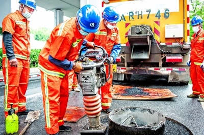 铣刨器切割井盖及周边路面、破除混凝土层、清理井盖……施工人员有条不紊作业,记者留意到,清除混凝土层时,施工人员在井口放了一个接料盘,大块碎石清理完后,又拿出一个吹风机对着井槽吹。周毅恒解释:“这样是防止碎料掉入井内,小颗粒也要吹干净,不然影响上乳化沥青的黏合度。”刷过乳化沥青这道“胶水”后,一辆沥青养护车开来,施工人员迅速铲起还冒着热气的沥青混合料,铺在井槽内,另一组工人架起蛙式打夯机,将沥青夯实,“5厘米一层,铺三层,分层碾压,这样可以达到95%压实度,避免后期井盖沉降”。
