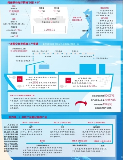 “‘国信1号’将深远海养殖从蓝图变成了现实。”中国工程院院士麦康森说。从上世纪70年代的一个关于“未来海洋牧场”的构想、中国水科院渔机所落于纸面的“蓝图”,到作为全球首艘10万吨级养殖工船交付使用,“国信1号”跨越了关于海水养殖、船舶制造、资本运作、产业运营的多领域难题。这艘249.9米长的“渔业养殖航母”将养殖区域从近岸推向了深远海。通过利用全球优质海水资源进行养殖,为我国持续输入高品质蛋白供应,成为我国流动的“蓝色粮仓”,掀起我国第六次海水养殖浪潮。