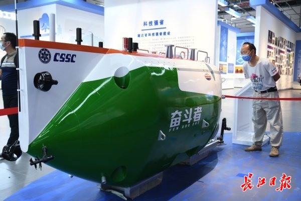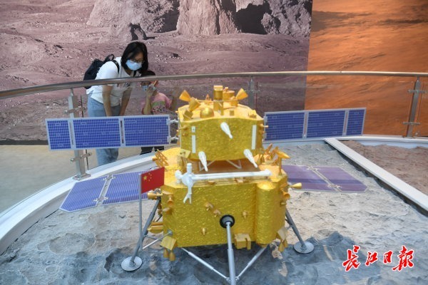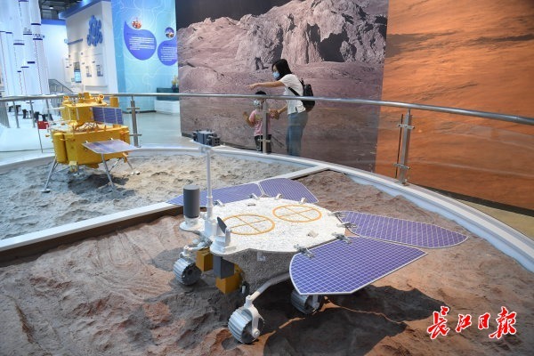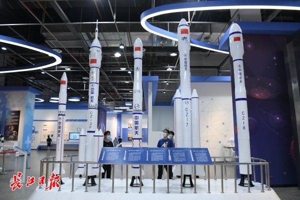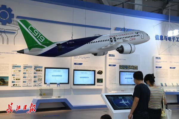 长江日报大武汉客户端5月28日讯 28日,湖北省科技馆,中国工程院院士专家成果湖北展示与转化中心的重大科技成果为主题的科普展品吸引市民观看,民用大型客机C919模型、长征系列运载火箭模型、海上钻井平台“蓝鲸二号”模型、“祝融号”火星车模型、“嫦娥五号”月球探测器模型、载人潜水器“奋斗者号”模型以及新冠病毒预防知识模型等科普展品,向观众展示了中国科学家的重大标志性科技创新成果。