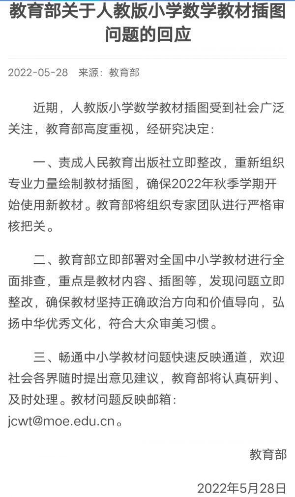 教育部官网发布《教育部关于人教版小学数学教材插图问题的回应》: