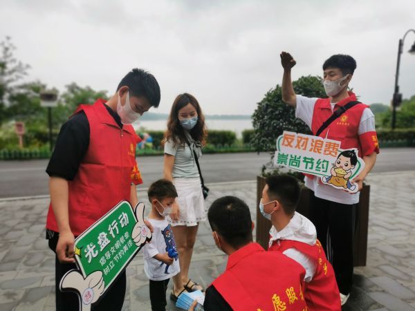 带着孩子来东湖海洋乐园游玩的周女士一家,在东湖绿道与志愿服务小队相遇,在宣讲中,正读小学3年级的晗晗指着“反对浪费,崇尚节约”的标语牌大声回应道:“这个我知道,老师教过,不要浪费粮食,要坚持光盘行动!”志愿者们纷纷为她点赞。周女士笑着说:“东湖的文明宣传很接地气,作为市民我们也会坚决配合景区做好防疫工作,文明旅游。”