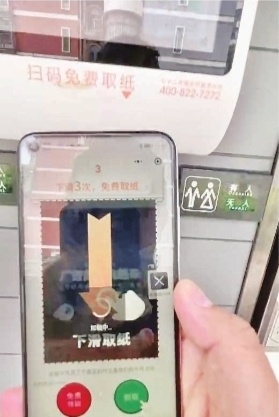 扫码取纸界面,下滑屏幕三次可免费取纸。 记者杨荣峰 摄