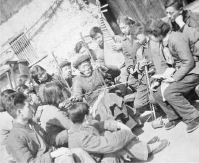 民间音乐人拉二胡,右边拿着笔和笔记本的是武汉音乐学院下乡采风的女老师(资料图)。