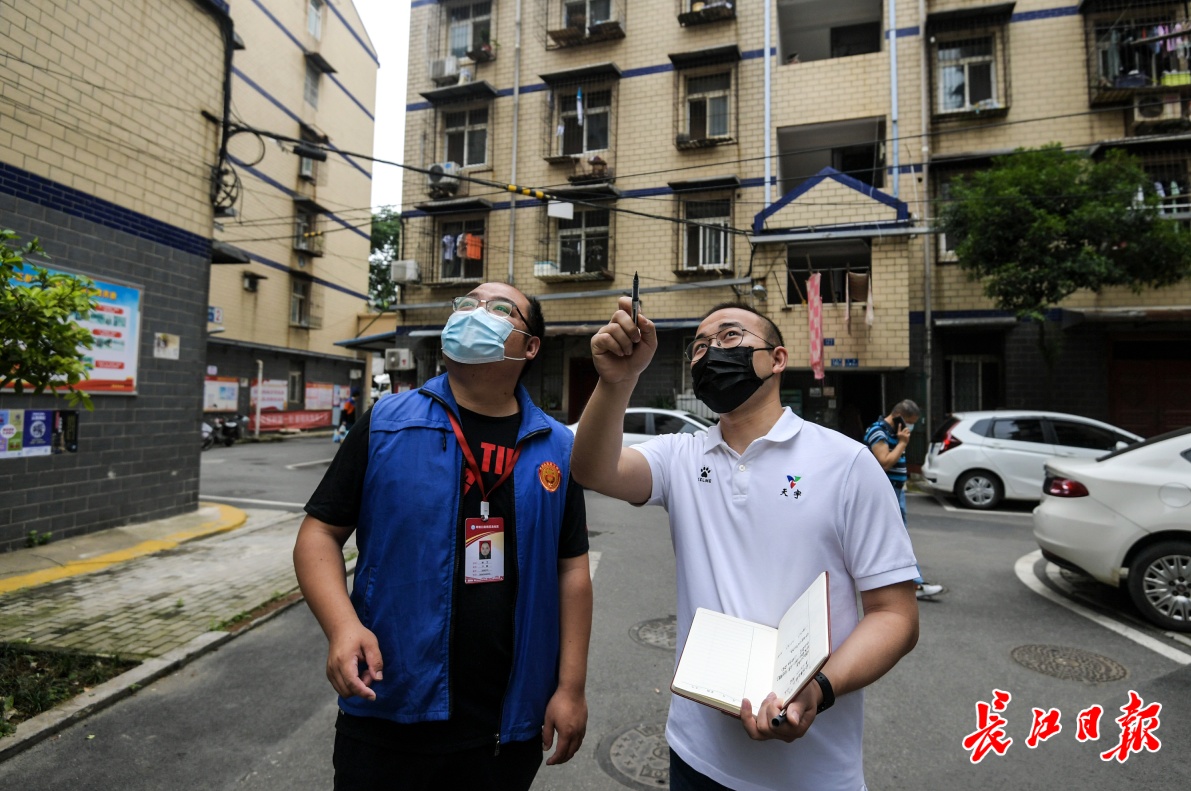 汉阳区人大代表乐毅和社区网格员在汤家咀小区实地查看。记者史伟 摄