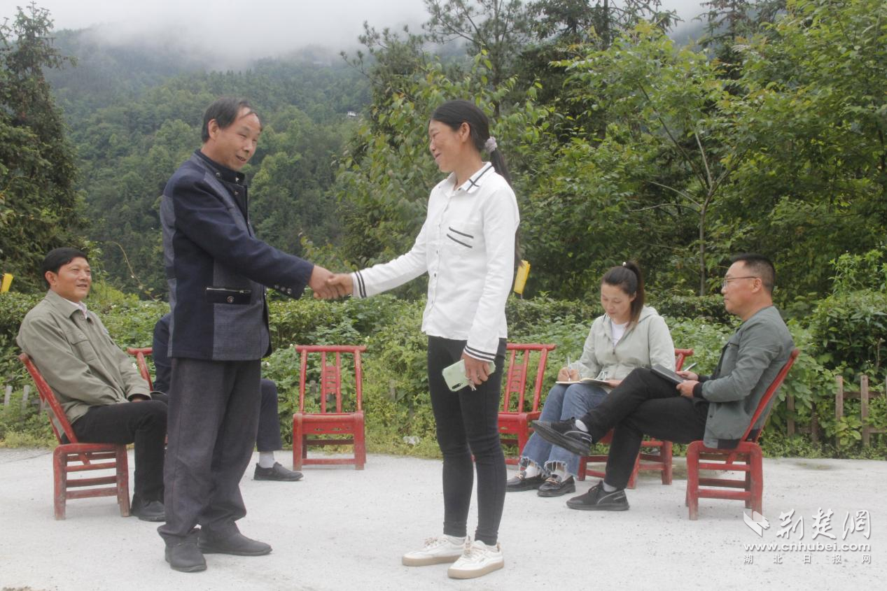 5月25日,建始县官店镇猪耳河村五组邓家庭院里,刘某和邓某间的田界权属纠纷,在由党员代表、村民代表、乡贤人士组成的“评理说事”调解小组的见证下,握手言和。