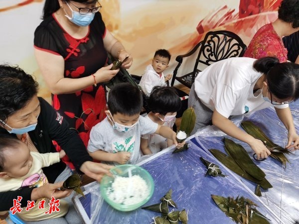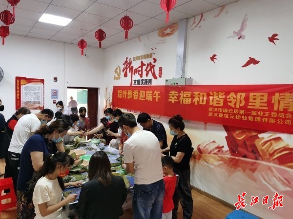 在江岸区后湖街胜华社区,居民和社区群干、物业员工一起包粽子、话家常,共同感受端午节的浓厚氛围。
