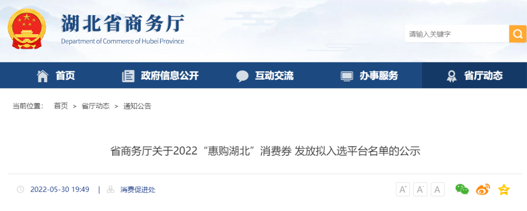 为贯彻落实省政府办公厅《关于加快消费恢复提振的若干措施》(鄂政办发〔2022〕22号)决策部署,统筹做好2022“惠购湖北”消费券发放工作,省商务厅2022年5月23日发布了《关于征选2022“惠购湖北”消费券发放平台企业的公告》。5月28日,按照公开、公平、公正的原则,我厅组织召开了“2022‘惠购湖北’消费券发放平台”专家评审会,专家组审核后提出了专家评审意见。经厅长办公会研究,确定支付宝(中国)网络技术有限公司(支付宝)、中国银联股份有限公司湖北分公司(云闪付)、北京三快在线科技有限公司(美团)、中国建设银行湖北分公司(建行生活)、北京微字节网络科技有限公司(抖音)、中国电信股份有限公司湖北分公司(翼支付)6家平台为2022“惠购湖北”消费券发放拟入选平台。现予公示,公示期3天,公示时间为2022年5月30日至6月1日。