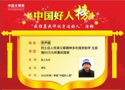 5月30日,中央文明办发布2022年第一季度“中国好人榜”,革命后代李声䭲上榜“助人为乐好人”。李声䭲是革命烈士、中共一大代表李汉俊的小女儿。