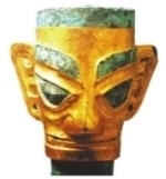 三星堆出土的戴金面罩的青铜人头像。