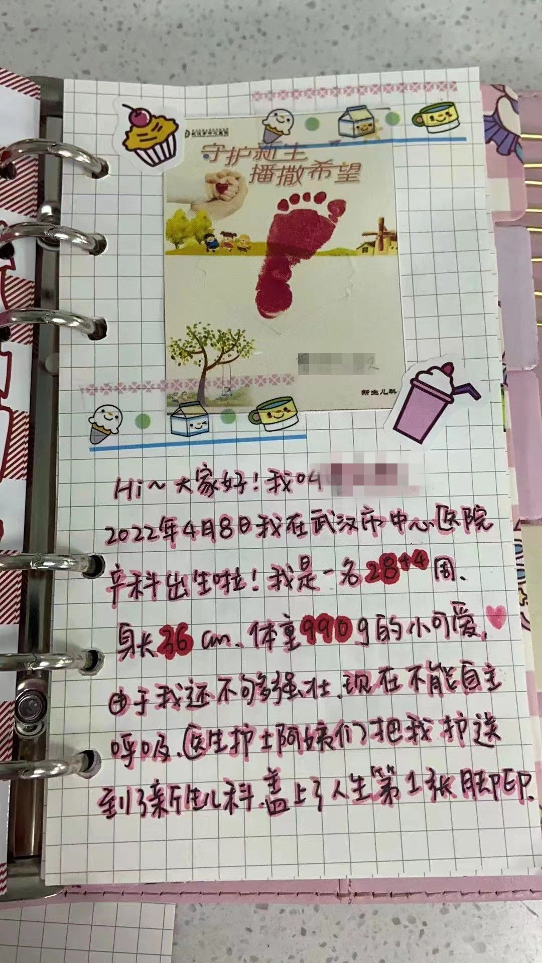 “4月8日我出生啦,由于我还不够强壮,现在不能自主呼吸……”