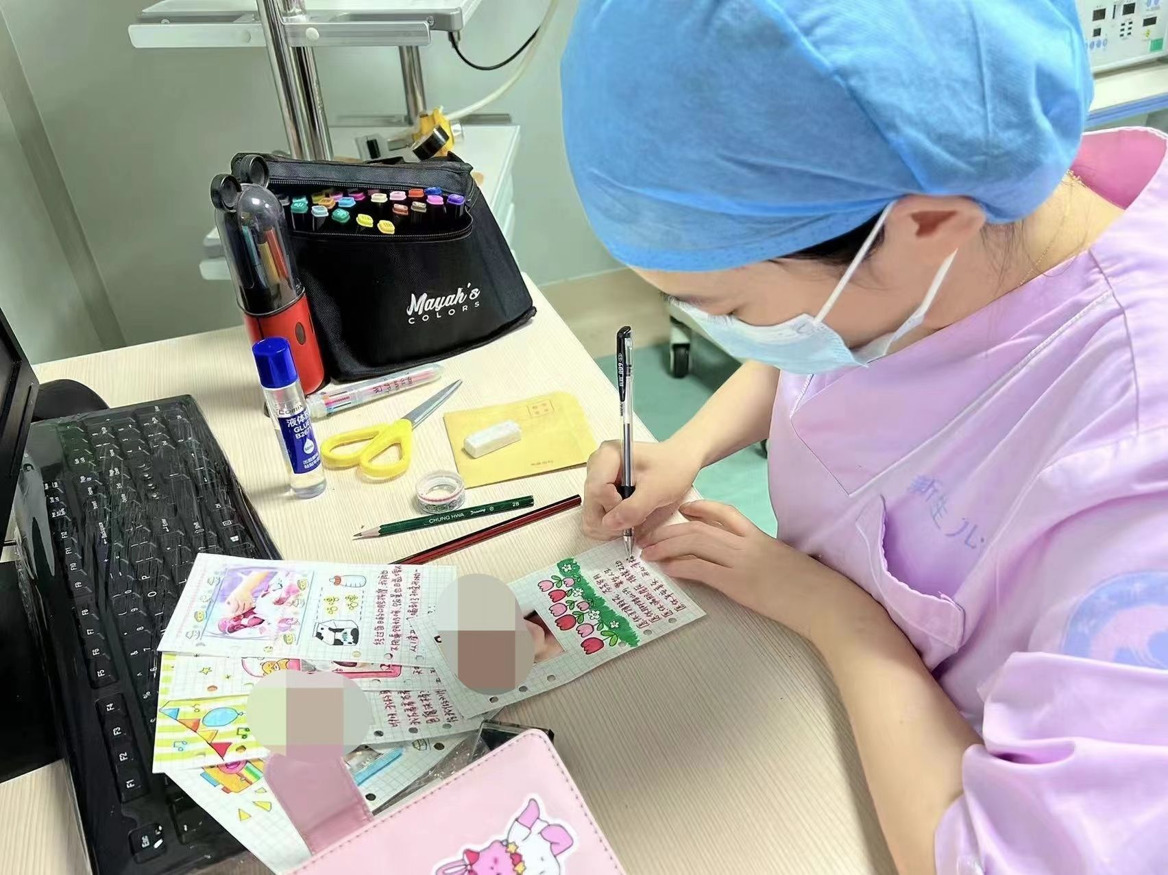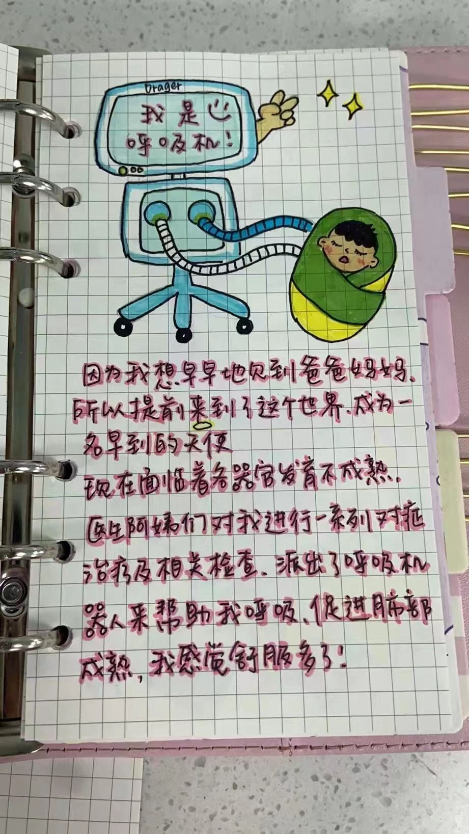 “我住进了我的专属小房子,医生护士阿姨们都悉心呵护我在她们24小时不间断的守护下,即使暂时见不到爸爸妈妈,也不会孤单啦。”