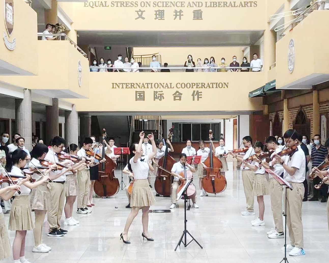 5月30日8时,武汉外校初中部校管弦乐团在教学楼一楼空地上给全校师生演奏了两曲:《名侦探柯南》和《第二圆舞曲》。有的团员没有加入大部队,直接在走道上开练!