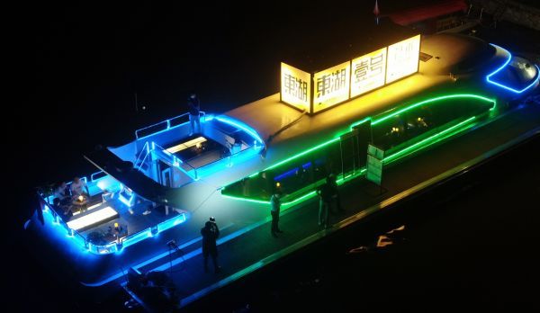 在东湖绿道楚风园码头,楚汉茶艺游艇、东湖壹号艺术club游艇在碧波上漂浮,这里为游客提供了一方水上休闲区域。步入东湖壹号游艇,星空顶、月亮灯、民谣舞台,现代艺术气息扑面而来,在水上品味精致下午茶,备受武汉“弄潮儿”的青睐。