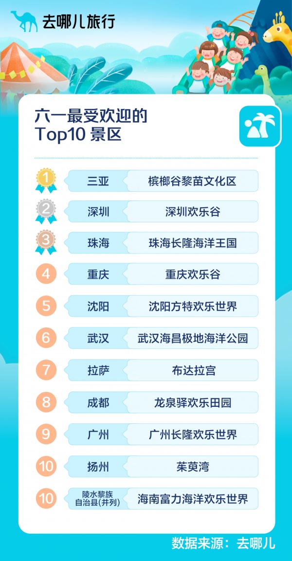 从去哪儿全国的景区门票预订来看,截至5月30日,“六一”最受欢迎的十大景区分别是:三亚槟榔谷黎苗文化区、深圳欢乐谷、珠海长隆海洋王国、重庆欢乐谷、沈阳方特欢乐世界、武汉海昌极地海洋公园、布达拉宫、成都龙泉驿欢乐田园、广州长隆欢乐世界、扬州茱萸湾及海南富力海洋欢乐世界(并列)。从去哪儿消费者画像来看,“六一”亲子出行占比达到近七成。