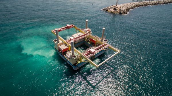 中长周期波涌浪海域自身式碎石桩施工平台。