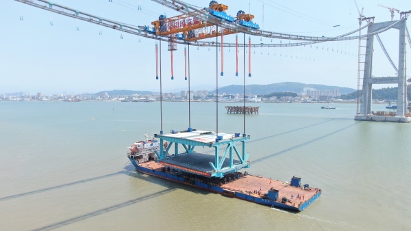 深中通道上的一体化智能筑塔机。