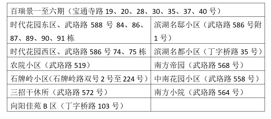 中山路3B0-446号(双号)、张之洞路275号、张之洞路284号、张之洞路286、288号、张之洞路268号、中山路450号、武路路57号、93号、114号、千家街1-76号、大东门铁路小区、大东门三村1-5号、大东门四村1-24号、中山路487号(南国·新东城)、中山路499-515号、中山路495、497、517、519号