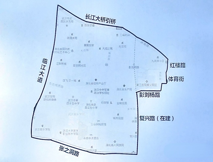 武车一、三、五、六、七村、教工宿舍、长江锅炉厂宿舍、鹏程帝景园、惠誉花园、秦园居、路灯工区宿舍、安居苑小区、交警宿舍、长航宿舍、治电村宿舍、石油宿舍、舒苑大厦、清芷园、梦湖水岸、金港苑、沙湖公馆、三角新村、长鑫家园、绿地金融城、水岸国际毫岚天下、水岸国际澜桥公馆2期、友谊小区、七星绿色花园、徐东二路2号油料所宿舍北区、大湖公寓、刘家河小区、陈家河小区、王家湾小区、陈家湾小区、三角花园余家湖小区。