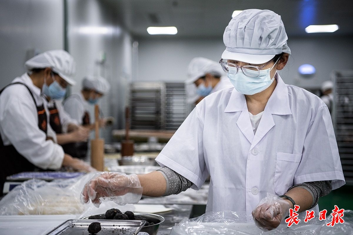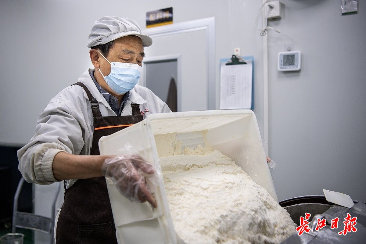 口罩、白衣、白帽、围裙,一一穿戴好,消毒,进入配料区,将面粉倒入桶中,边搅边加水和匀,半小时后,他揪起一团,扯开,至薄如蝉翼而不破,这才满意地将这桶做酥饼的面料发到下个工序。