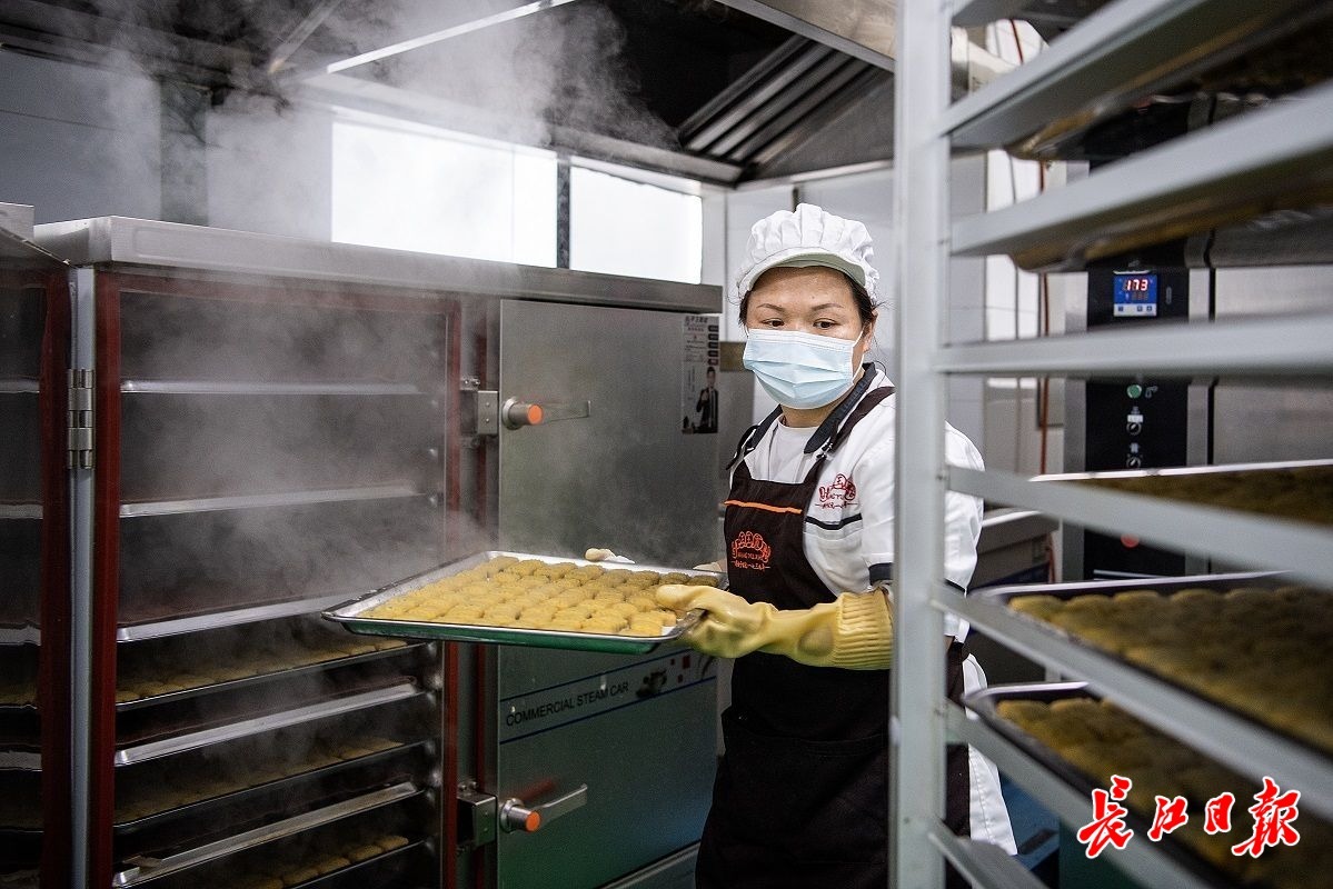 一位师傅将刚出炉的绿豆糕摆上货架。
